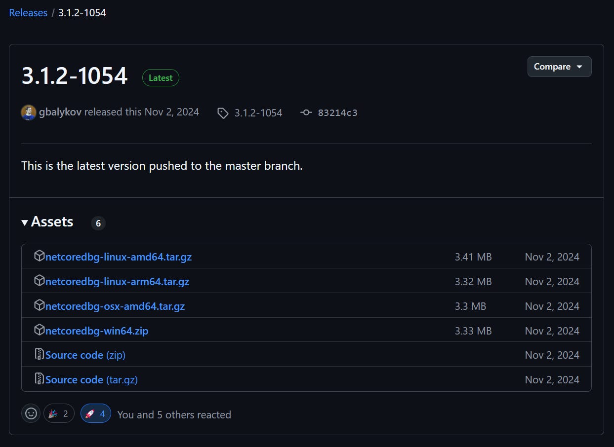 I have downloaded the latest release version (3.1.2-1054) for Windows (netcoredbg-win64.zip).macOS and Linux users should download their respective platform-specific files from the same release.